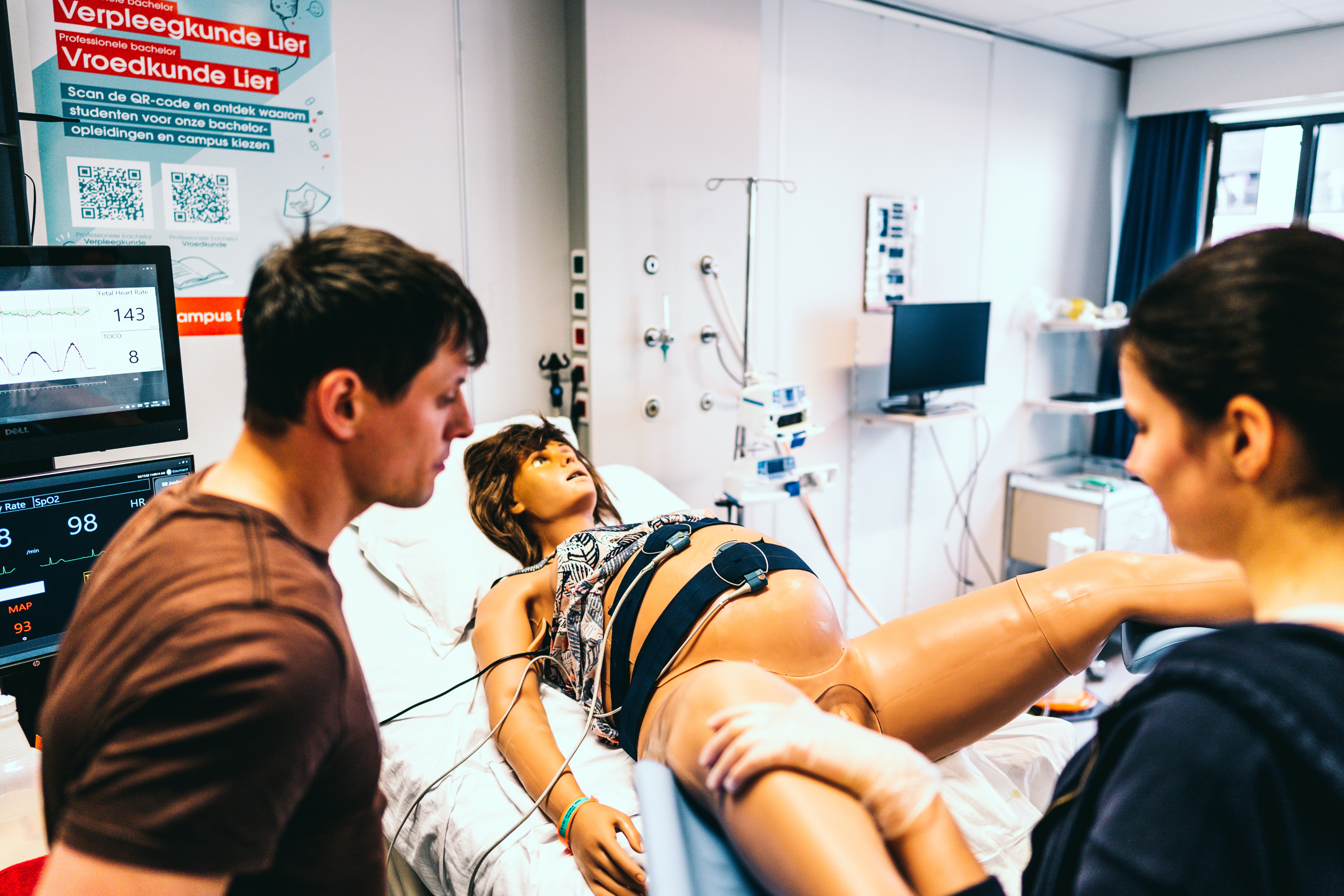 Eén van de highlights dit jaar is de Quest 3, een geavanceerde mixed-reality-bril waarmee Thomas More studenten Verpleegkunde en Vroedkunde opleidt. Met deze bril verschijnt een virtuele patiënt letterlijk in de ruimte om je heen. Je observeert vitale functies, analyseert lichamelijke signalen en stelt een diagnose. De patiënt is er niet écht, maar de ervaring wél. "Met de virtuele patiënt brengen we de praktijk een stap dichter bij de student", vertelt Peter Vervoort van Thomas More. In een andere demo kan je leren reanimeren op CPR-poppen die directe feedback geven. Duw je hard genoeg? Snel genoeg? De pop laat het meteen weten. Een AED-apparaat om te oefenen staat ook klaar. Vervoort: